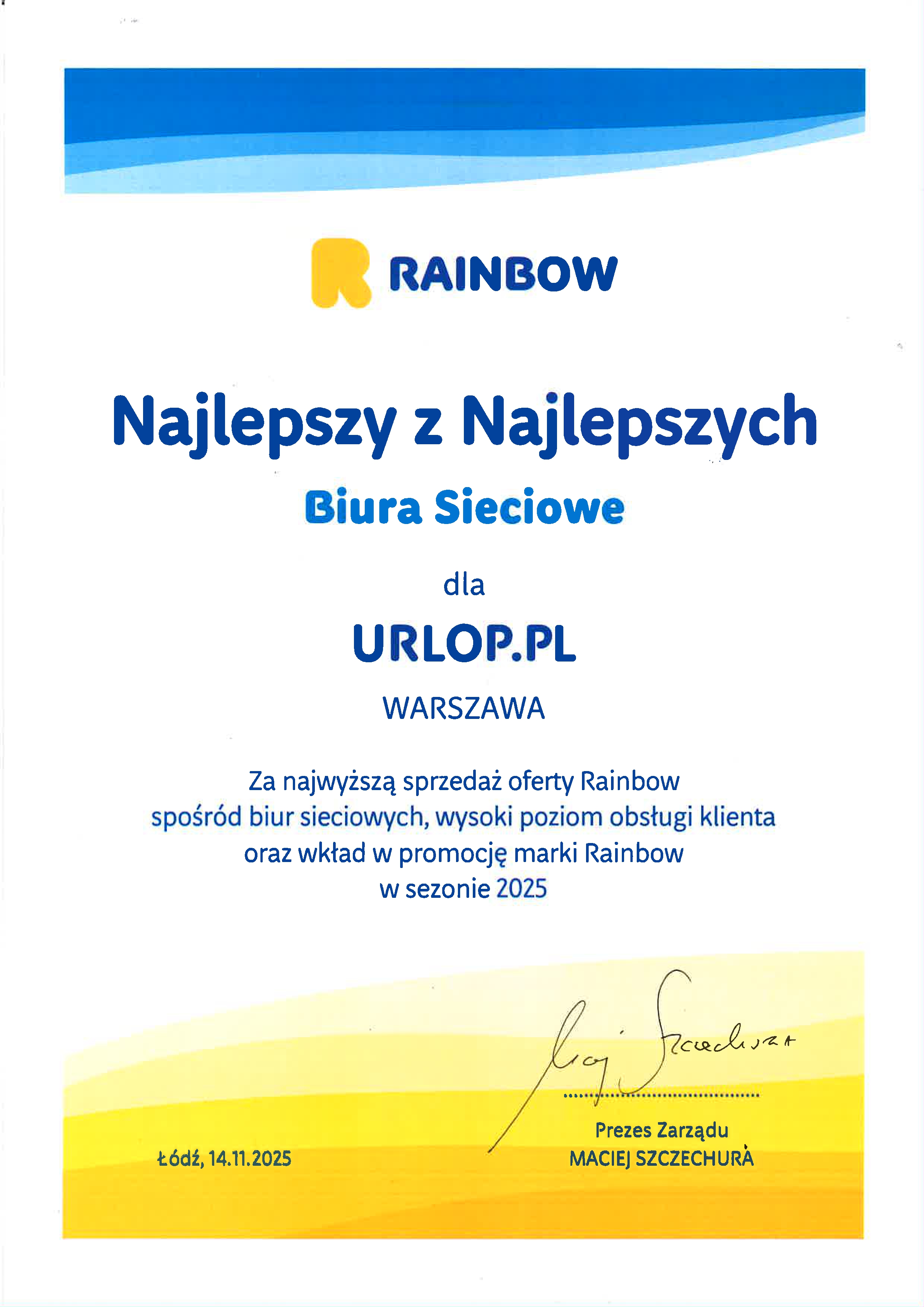 - Rainbow Tours – wyróżnienia za najwyższą jakość obsługi i wyjątkowe wyniki sprzedaży.
